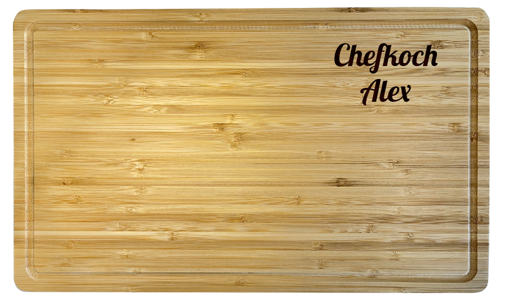 Anschließend gründlich abtrocknen Nicht für die Spülmaschine geeignet Details Details Schneidebrett "Chefkoch" mit Ihrem Namen Größe 23 x 15 x 1,2 cm oder 33 x 25 x 1,2 cm Farbe Hellbraun Gewicht 260 gr oder 630 gr Abgerundete Ecken und Kanten Material Bambus. Mehr anzeigen weniger anzeigen *Ausführung *Wunschname. Sie können das Schneidebrett mit individuellen Namen, diversen Schriftzügen und ganzen Gedichten gestalten Wer lieber Symbole, Logos oder Bilder auf dem Holzbrett mit Gravur haben möchte, kann das ebenfalls nach eigenen Wünschen und persönlichem Geschmack derart gestalten.
