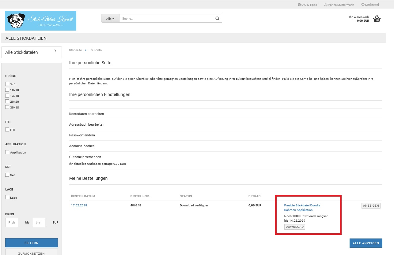 Es hat kostenlose Stickdateien zum Herunterladen auf der Homepage Somit können Sie testen, wie die Dateien hergestellt sind und ob Ihre Stickmaschine oder Ihre Sticksoftware das Stickformat lesen kann Es hat auch zwischendurch immer wieder einige gratis Stickdateien zum Herunterladen Zu den kostenlosen Stickdateien. Ihr könnt dann in eurem Konto die Stickdateien runterladen Wie das geht könnt ihr weiter unten im Video sehen Es gibt prinzipiell 2 Möglichkeiten (a und b werden nachfolgend beschrieben) a) Download mit Anmeldung im Kundenkonto auf wwwrockqueende Kurze StepsAnmeldenauf meine Bestellungen gehenBestellung auswählen. Stickdateien Diese Stickdateien können mit herkömmlichen Stickmaschinen (nicht Nähmaschinen) selber gestickt werden Es handelt sich hier nicht um gefertigte Produkte Daher ist ein digitaler DirektDownload nach Zahlung per PayPal möglich Bei Zahlung per VorabÜberweisung wird der Download manuell nach.