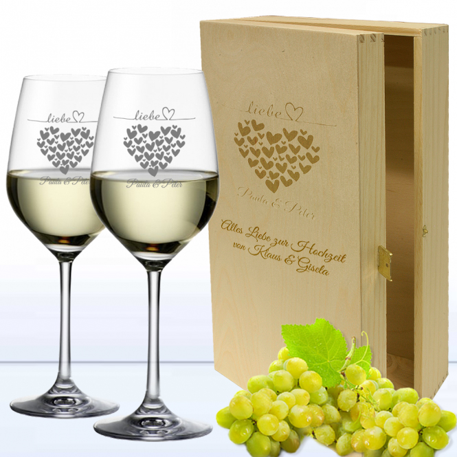 Edle Weissweinglaser In 2er Holzkiste Mit Namen Und Herzen Graviert Geschenkplanet