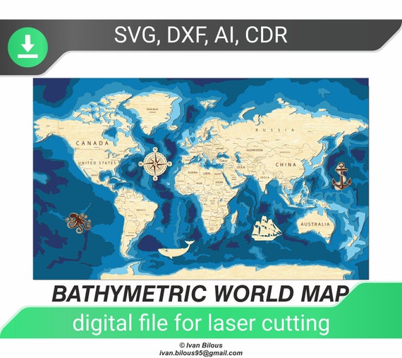 Layered World Map Dxf File For Laser Cut Template Bathymetric Etsy