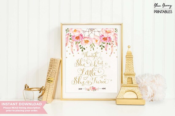 Pink Boho Floral Nursery Printable Art Though She Be But Little She Is Fierce Pink Gold Bohemian Flowers Baby Girl Shower Decor Flo12a By Blue Bunny Printables Catch My Party