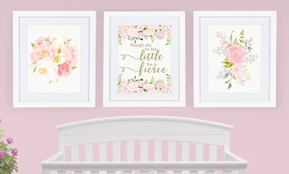 Nursery Wall Art Watercolor Flowers Though She Be But Little She Be Firece Pink And Blush Floral Watercolor Peonies Watercolor Roses 3 Set By Capturememoriesshop Catch My Party