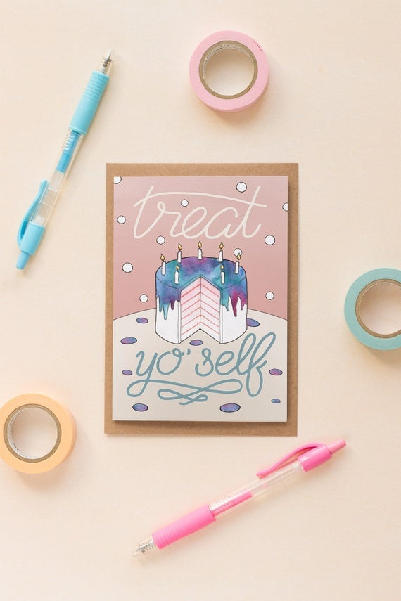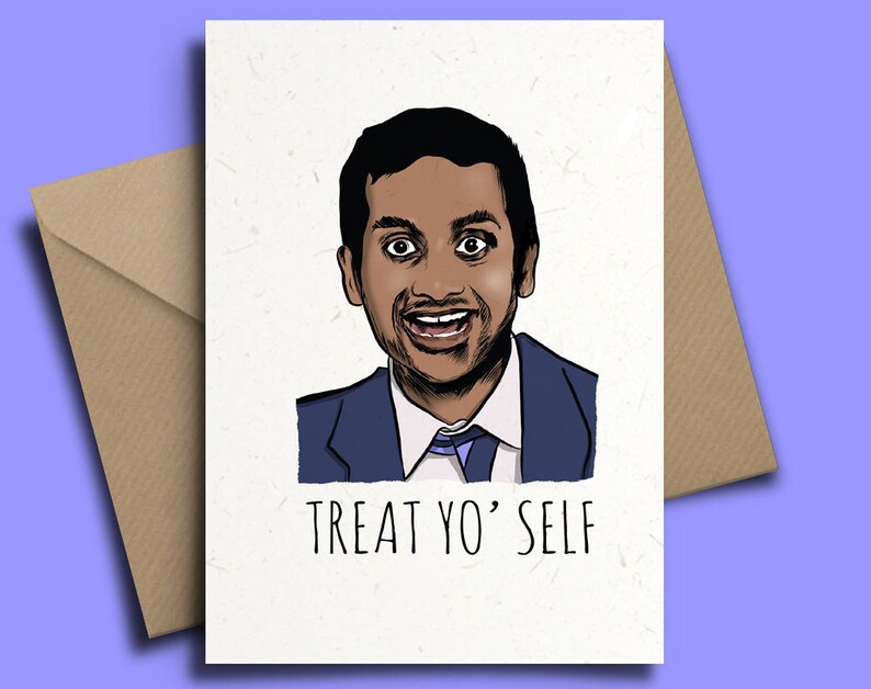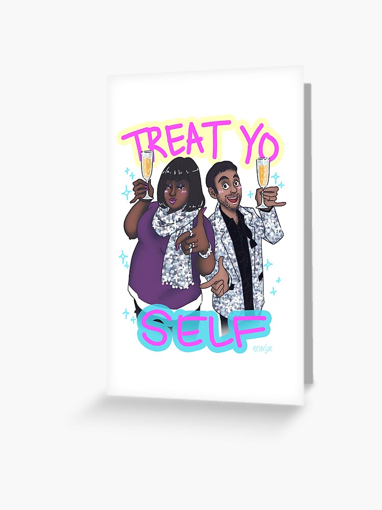 Treat yo self Cards are A6 size, printed on highquality hammered card, and come with an envelope I can add a message to your card and send directly to the recipient, just let me know!. Treat Yo Self Birthday Card featuring our Retta and Aziz Ansari illustration!. I sent my cards out protected in boardbacked envelopes to make sure they arrive in perfect condition.