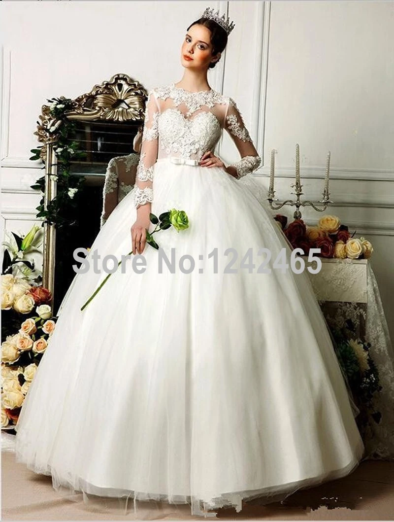 Amazing Ball Gown Lace Tulle High Neck Long Sleeves Chapel Train Wedding Dress Victoriagowns