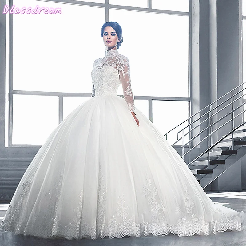 Full Sleeves Lace Wedding Dress High Neck Vintage Bridal Dresses Ball Gown Hot Sale Illusion Buttons Vestido De Novia Wedding Dresses Aliexpress