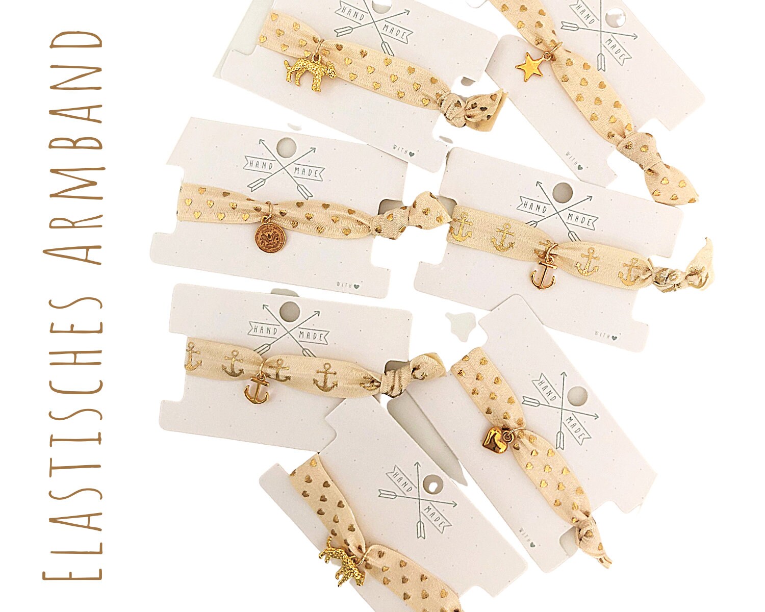 Elastic Bracelet Hair Rubber Webband Beige Gold Anchor Boho Hippie Pendant Anchor Star Heart Leopard Jewellery Card