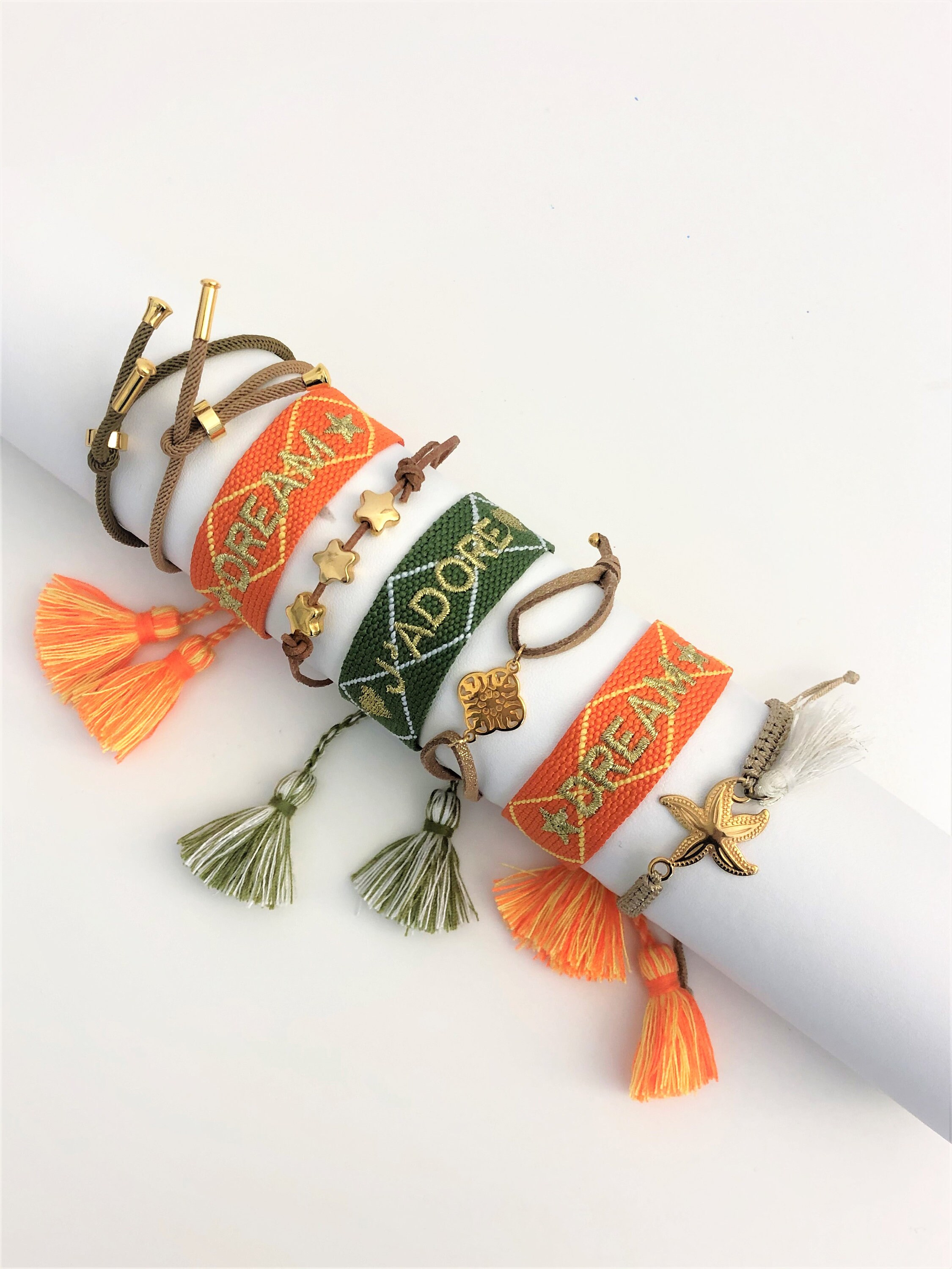 Friendship Bracelet Webband Orange Green Gold Knotted Woven Bracelet Ibiza Tassels Boho Hippie Ribbon Leather Ribbon Stars