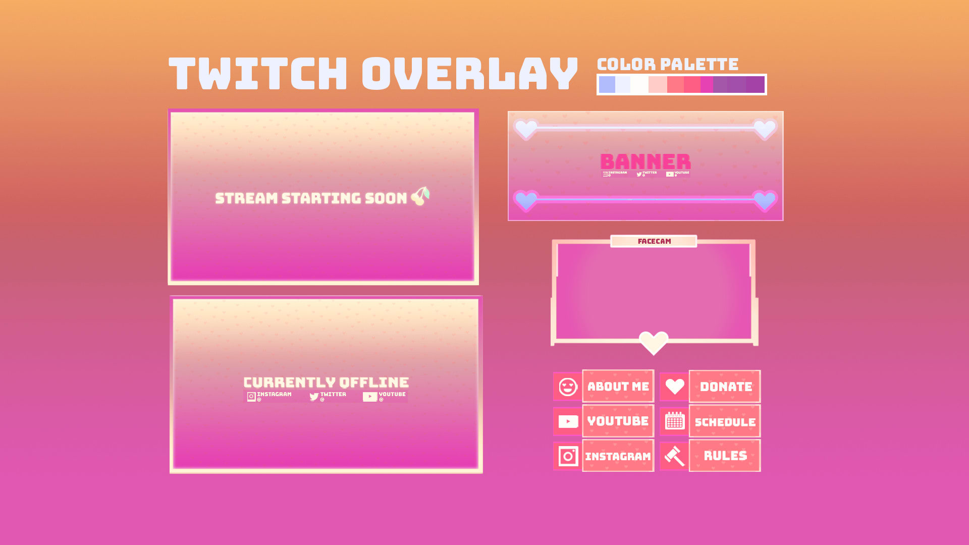 Pink Twitch Stream Overlays Banners Profile Panels Cute Animated Video Scenes Graphics