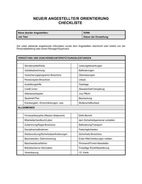 Neue R Angestellte R Orientierung Checkliste Vorlagen Und Muster Biztree Com