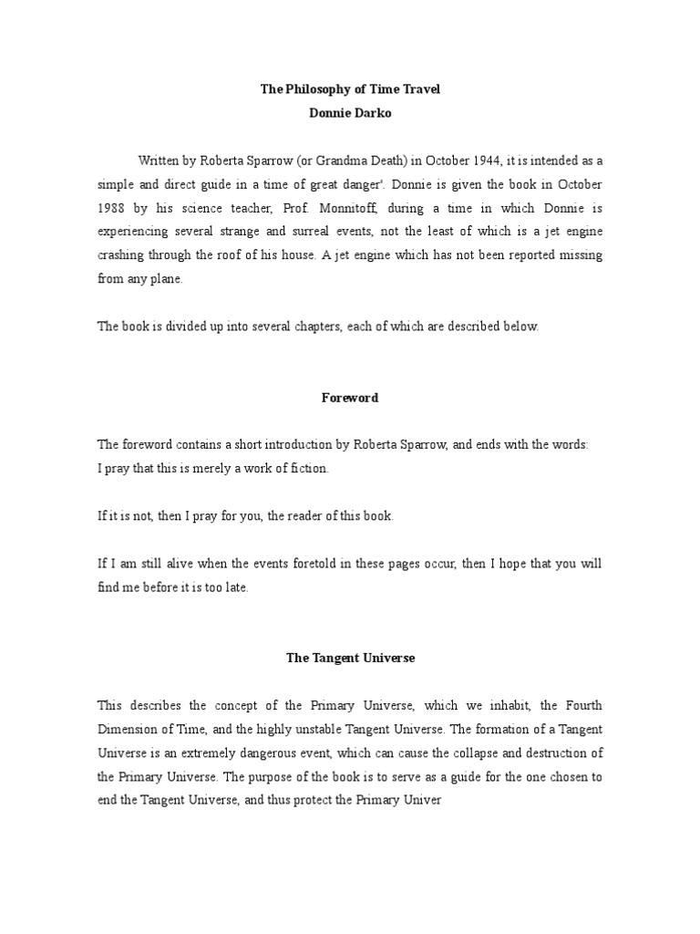The Philosophy of Time Travel Page Blank Journal A journal for those of us trying to figure out the Primary & Tangent Universe Soft cover, easy to carry Inside pages are lined and semiblank for writing, sketching or doodling, with inspirations from the movie Donnie Darko pages for notes, lists, inspiration or anything else. The Philosophy of Time Travel The is the text of the fictional book, “The Philosophy of Time Travel” by Roberta Sparrow which is heavily referenced in the movie Donnie Darko The “Philosophy of Time Travel” is a fictional book written by character Roberta Sparrow, or more commonly referred to as “Grandma Death”. Several schools of philosophy have their own views on the issue For instance, the presentist view holds that time travel is impossible, because they completely deny the existence of the past and the future And so, how can one possibly travel to a “time period” that does not exist at all.