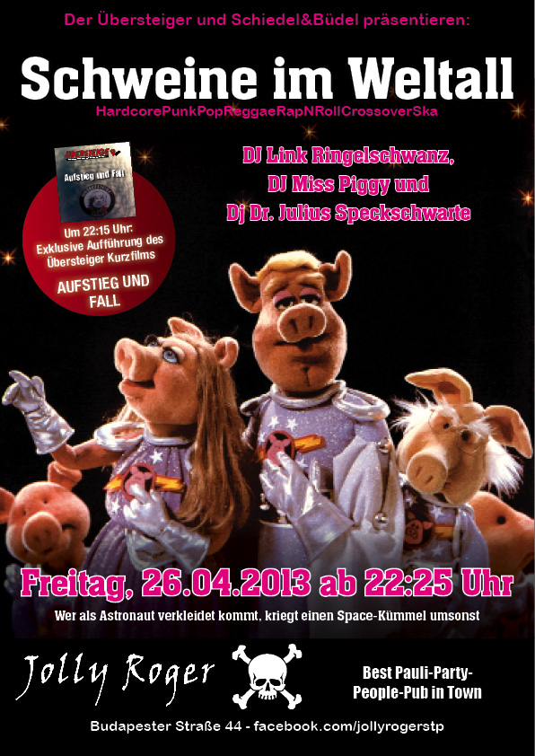 Schweine im Weltall, die muppet Show. Sie sitzen im Hörsaal,und sie reden nicht;sie hängen in der Disco,und sie tanzen nicht;sie lauschen in der Leitung,und man merkt es nicht;Schweine in Zivil übersieht man nicht!Schweine im Weltraum starten zu den Sternen,Schweine im Weltraum erobern das All,Schweine im Weltraum sind überall,Schweine im Weltraum!Sie gehen ins Kaufhaus,und sie klauen nicht;sie bauen fette Joints,und sie. Forum der Allianz Schweinewerfer Schweine im Weltraum Insgesamt ist 1 Benutzer online 0 Angemeldete, kein Unsichtbarer und 1 Gast Der Rekord liegt bei 7 Benutzern am Sa Apr 14, 12 506 am Angemeldete Benutzer Keine Heute hat kein Mitglied Geburtstag.
