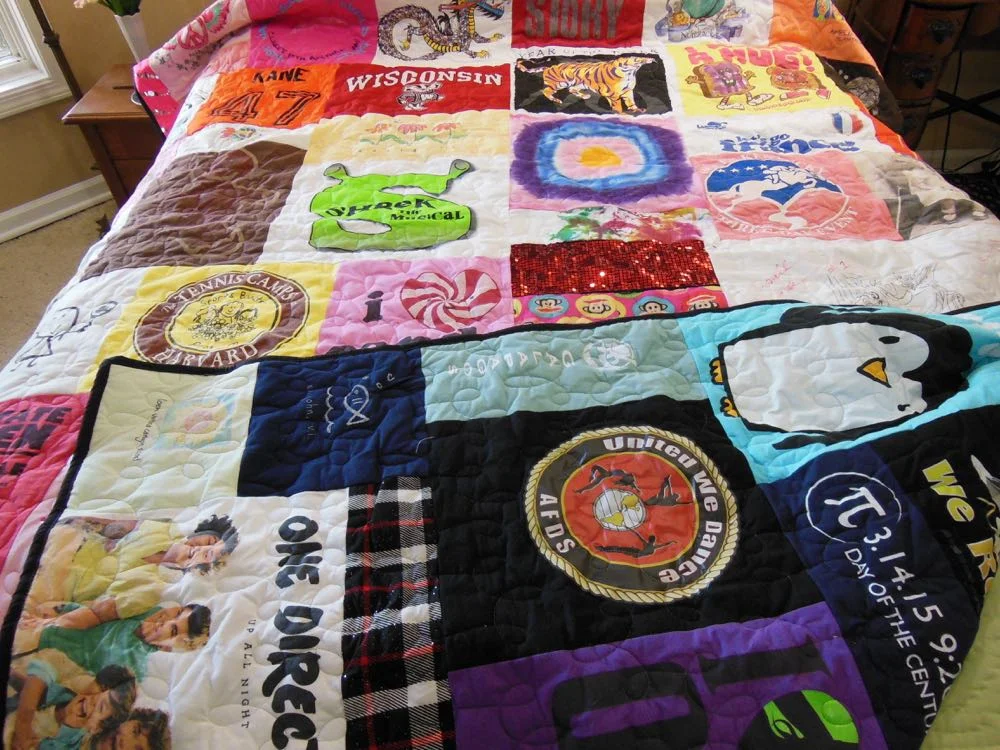 TShirt Quilts Custom TShirt Quilts made from your tshirts, sweatshirts, ties, socks, hats, baby outfits, and any other memorable fabric If you are like most people, you have a pile of treasured old tshirts you just can't bear to throw away. You have a great collection of tshirts that you no longer wear but can’t bear to part with Protect those treasured memories in a Mosaic Tshirt Quilt by Journey Quilt Company We will help you transform your favorite tees into a fun, functional, fabulous quilt that you will enjoy curling up with for a lifetime!. When making a tshirt quilt iron featherweight interfacing on the back of the tshirt it won't stretch or get whacked out of shape I make all my tshirt quilts with fleece on the back Great graduation gift moonlake from America on October , 15 Beautiful quilt My friend has made a couple they are so nice.