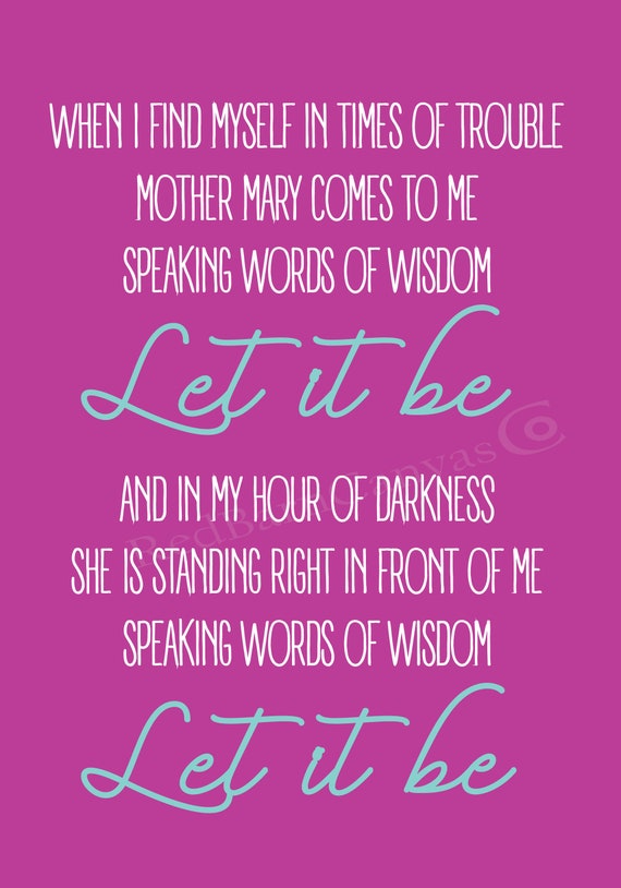Let It Be Lyrics When I find myself in times of trouble, Mother Mary comes to me / Speaking words of wisdom, "Let it be" / And in my hour of darkness, she is standing right in front of me. Videoklip, překlad a text písně Let It Be od The Beatles And in my hour of darkness She is standing right in front of me Speaking words of wisdom, let it. Let it be, let it be history Let's not talk about it Let it be buried underneath Let's not talk about it Let's not talk, talk about it Let's pretend that we never did (Woahoh) Let it be, let it be history Let's not talk about it Let's not talk about it Let's not talk about it Let's not talk, talk about it Let's pretend that we never did (Woahoh).
