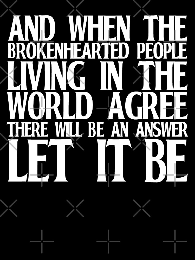 Let it be Let it be, let it be, let it be, let it be Whisper words of wisdom Let it be And when the brokenhearted people Living in the world agree There will be an answer Let it be For though they may be parted there is Still a chance that they will see There will be an answer Let it be Let it be, let it be, let it be, let it be Yeah, there will be an answer. / And this is the moment when I can be. Let it be, let it be Yeah there will be an answer, let it be Let it be, let it be, Let it be, let it be Yeah there will be an answer, let it be And though the night is cloudy, There is still a light that shines on me, Shine until tomorrow, let it be O, will I make up to the sound of music Mother Mary comes to me Speaking words of wisdom, let it be.
