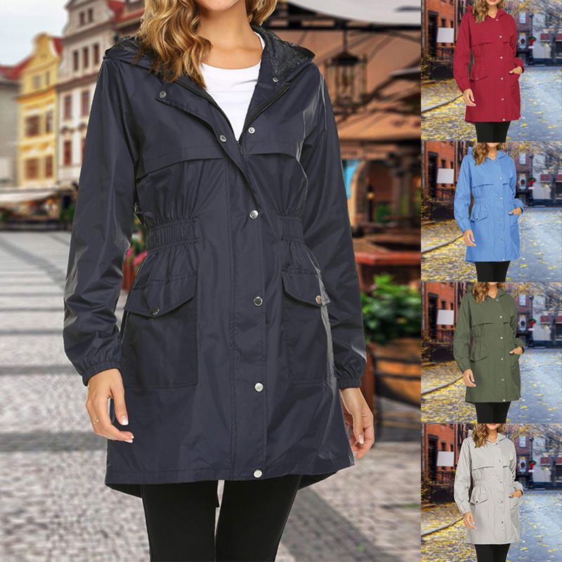Firss Damen Wasserdichter Regenjacke Trenchcoat Lange Regenjacke Bequem Windjacke Elegante Outwear Knopf Mit Taschen Mit Kapuze Mantel Amazon De Bekleidung