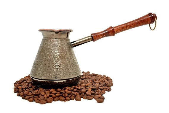 A cup of Turkish coffee, served from a copper cezve Type Coffee Country of origin Ottoman Empire Color Dark brown Turkish coffee (Turkish Türk kahvesi, Greek Τούρκικος καφές, Arabic قهوة تركية ) is a style of coffee prepared using very finely ground coffee beans without filtering. From Saad Fayed, Turkish coffee is famed for the way it is made It is prepared in an ibrik, a small coffee pot that is heated Sugar is added during the brewing process, not after, so the need for a serving spoon is eliminated Cream or milk is never added to Turkish coffee, and sugar is optional It is always served in demitasse cups In some regions, your fortune is told by the placement of. 12 DEMMEX 199 Oz Thick 2mm Copper Turkish Greek Arabic Engraved Coffee Pot Stovetop Coffee Maker Cezve Ibrik Briki with Wooden Handle & Wooden Pot Spoon, for 3 People (Copper);.
