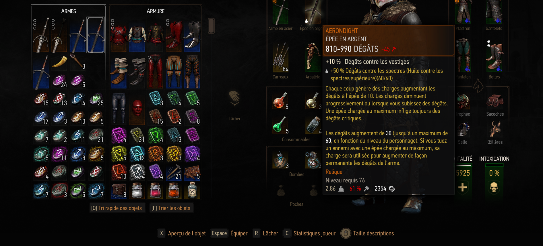Aerondight from Witcher 3's Blood and Wine expansion is one of the best silver swords in the entire game What makes the sword so great is the fact that every hit you land with it generates a bit of charge that increases the weapon's damage by ten percent (although you lose charges overtime or when Geralt takes damage). More The Witcher 3 Guides Console Commands (Cheat Codes) after that you receive the Aerondight Sword and the Achievement Here's the map It has a damage upgrade threshold and its threshold rises when you level up so don't worry when you maximize it You will get the chance to restack. The Witcher 3 HD Reworked Projects Primal Needs The Daily Monster Hunt Challenge Random Encounters Gwent Plus Plus Skilled Humans All Quest Objectives on Map Extra Animations Witcher Book Collection Devil's Pit Mod Sezon Burz Witcher's Gear Henry Cavill and Anya Chalotra FCR3 Immersion and Gameplay Tweaks LoreFriendly Witchers BLOOD Geralt.