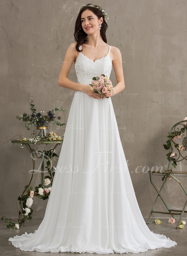 Charming A Line Sweetheart Spaghetti Straps Backless Chiffon White Wedding Dresses With Lace Fairy Beach Wedding Dresses Wd Dressmeet Com