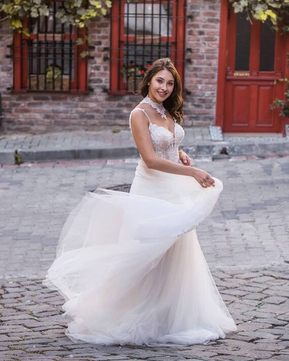 Wedding Dress A Line Lace Tulle Sweetheart Neckline Spaghetti Etsy