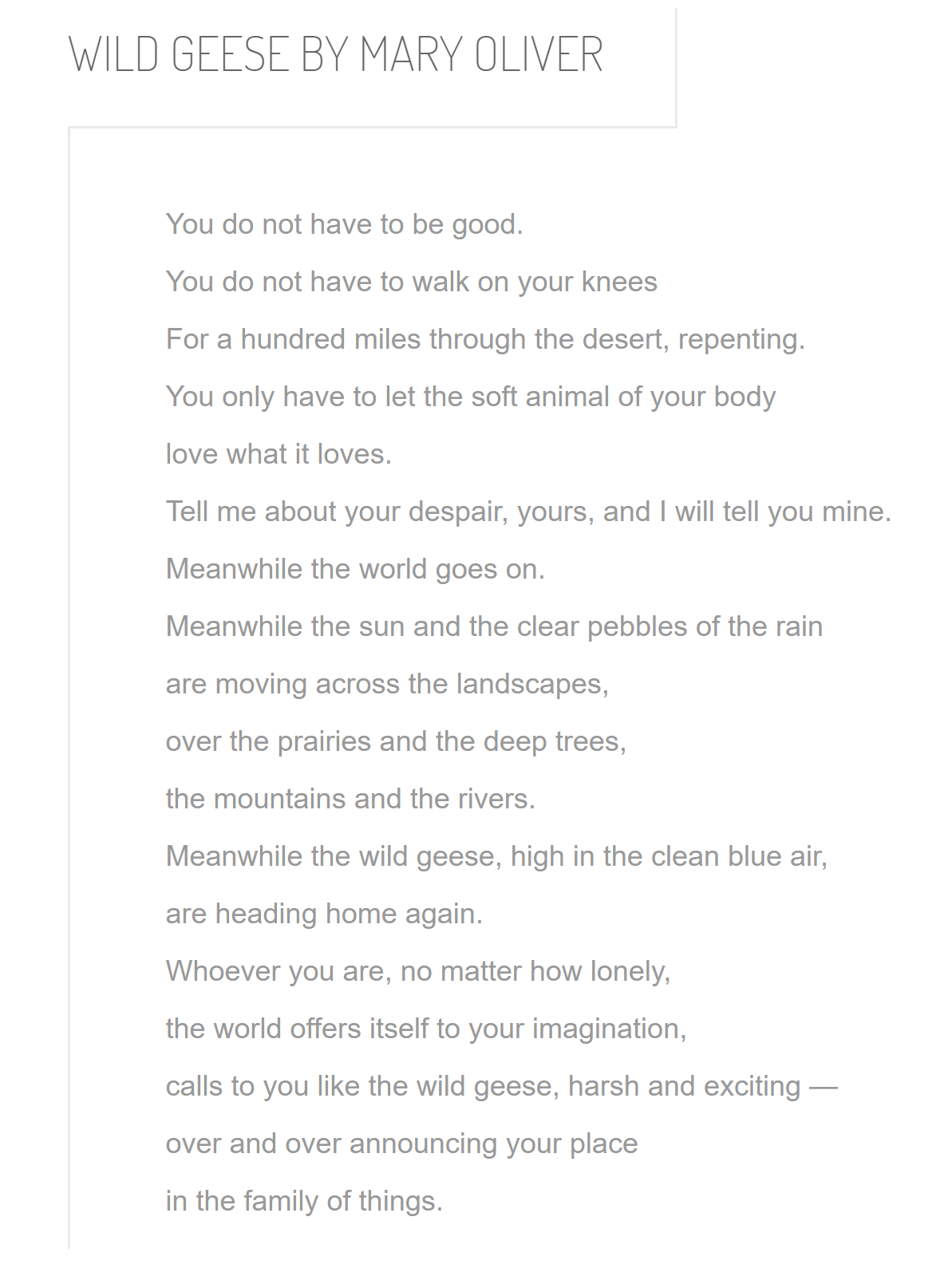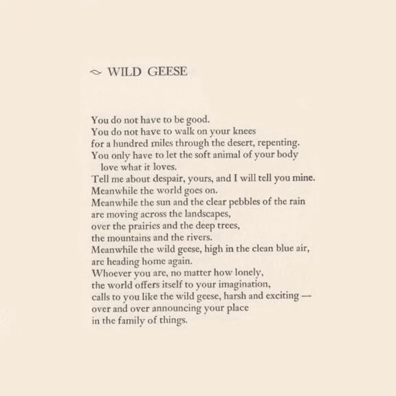 =Mary Oliver Poems for read think write Do Nows Wild Geese Wild Geese You do not have to be good You do not have to walk on your knees For a hundred miles through the desert, repenting You only have to let the soft animal of your body love what it loves Tell me about despair, yours, and I will tell you mine Meanwhile the world goes on. Wild geese mary oliver poem, poetry wall art, poetry print, Artwork Minimalist,Literary Quote, gift for her, quote print, quote wall art AmethystGarnetDesign From shop AmethystGarnetDesign 5 out of 5 stars (22) 22 reviews $ 567 Favorite Add to. =Mary Oliver Poems for read think write Do Nows Wild Geese Wild Geese You do not have to be good You do not have to walk on your knees For a hundred miles through the desert, repenting You only have to let the soft animal of your body love what it loves Tell me about despair, yours, and I will tell you mine.