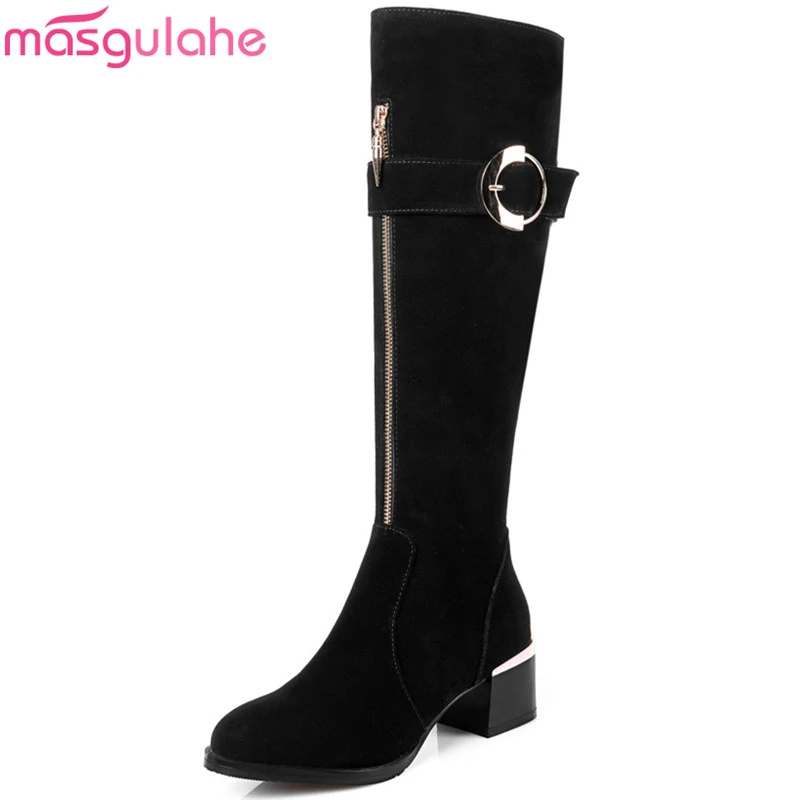 Masgulahe Schwarz Grau Frauen Stiefel Spitz Zipper Kuh Wildleder Damen Stiefel Schnalle Leder Platz Ferse Kniehohe Stiefel Knee High Boots High Bootsladies Boots Aliexpress