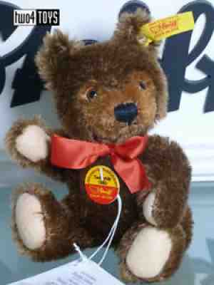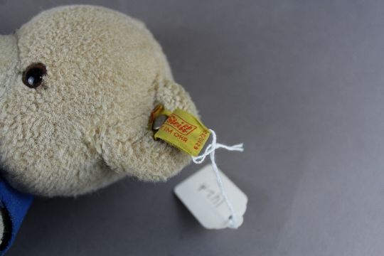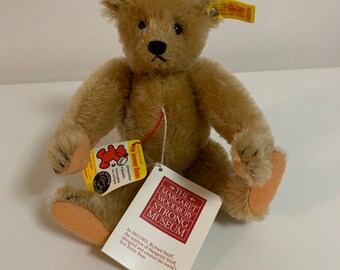 This wonderful Steiff bear is a replica of a 1904 Steiff bear that was made exclusively for the US market in the 1980s Teddy’s EAN is 0155/26 and he was produced between 19 and 1990 but this particular bear was born in the earlier years of that range as determined by the style of the ear flag which was used until approx 1987. Harlequin Steiff bear Originally made in 1925, this Steiff teddy bear was made from red and blue mohair Collectors often seek the original ones, and Steiff has reproduced this bear many times, including in miniature form 125th Anniversary Steiff bear Only 125 anniversary bears were created Their rarity makes them a bear many collectors. Tiny Steiff Teddy Bear Pocket size Poseable with Button In Ear Original Box and all s 1980's Mohair Made in Germany.