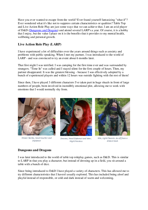 Unlike most LARP groups, we do not require you to get dressed up or talk old English We are here to recruit all people to the LARP world with an easygoing method Although we do encourage it!.