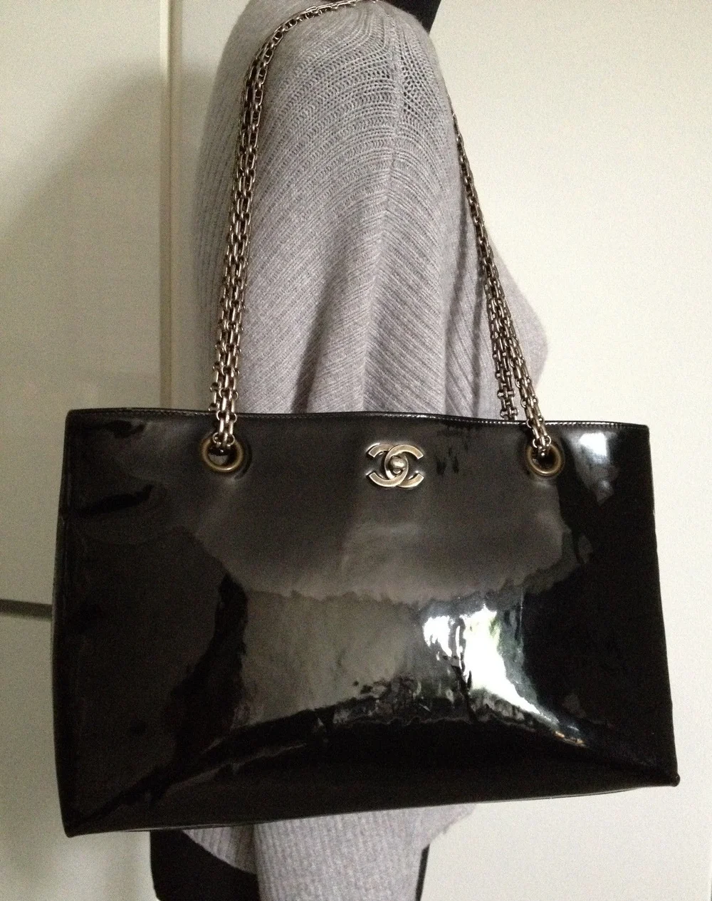 Sold 100 Classic Chanel Black Patent Leather Cc Silver Chain 13 Shopper Tote Bag My Dreamz Closet